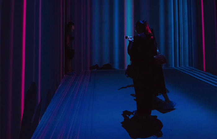 Between Lines is an audio reactive visual piece that uses a 4-screen set up as an immersive environment and using lines and cubic geometry to modify the perspective of the space. The visual composition evolves around the sound, taking data such as frequency and tempo to animate dynamically the content to distort the space and create a new architecture within it.