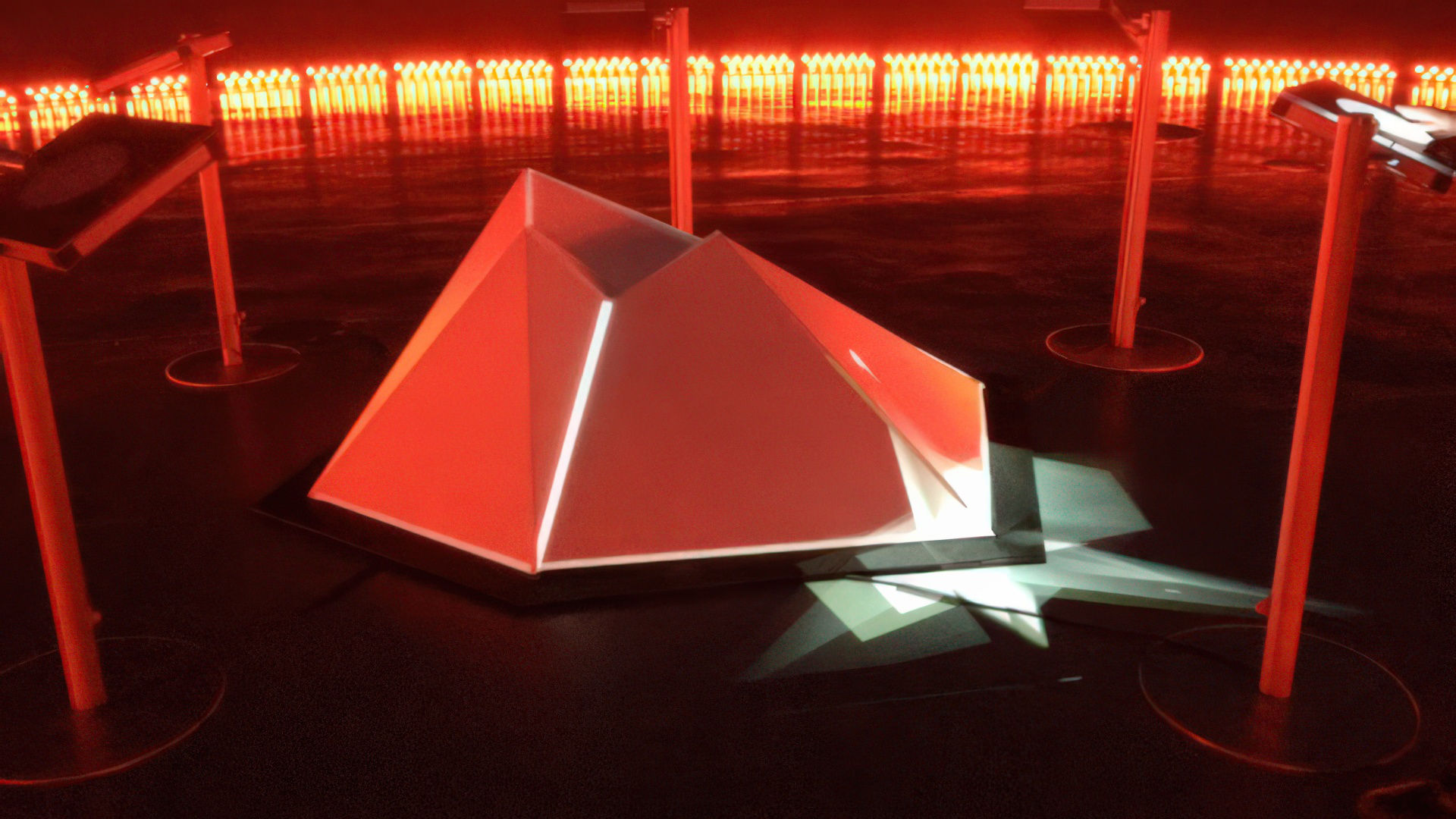 Floor projection possibilities gave us the idea to reshape the space, by placing prism sculpture made of foam board at the center of the environment, we aimed to represent the core of the creature and a way to connect with ObE. We designed a 3D model and exported it in a software called Pepakura Designer that unfolds it and gives you the piece you need to cut off in order to reconstruct it. Then in TouchDesigner we used CamSchnappr to adapt the mesh and project onto it.